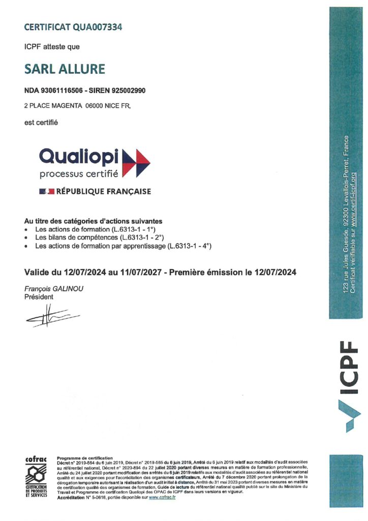 Allure est certifiée Qualiopi au titre des actions de formation, une certification délivrée par l’État qui atteste de la qualité de nos processus pédagogiques.